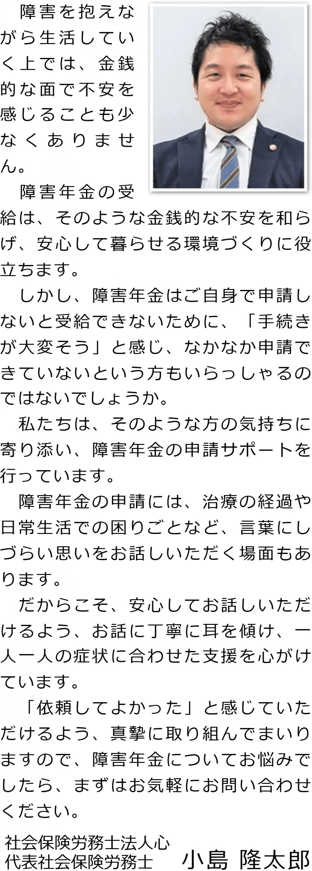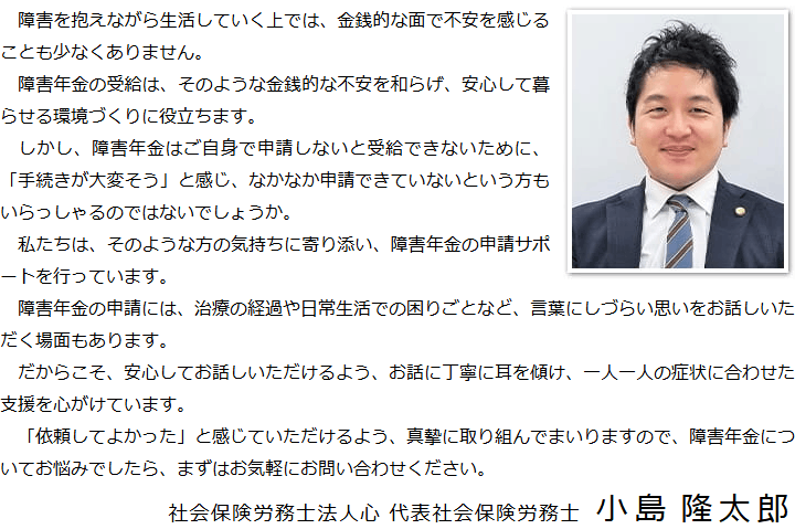 トップその他代表メッセージ 階層構造▼ その他(目次) 代表メッセージ その他(目次)その他トップ共通バナー※消さない障害年金無料診断サービス初めて障害年金を申請の方へ手続きの流れ代表メッセージ電話・テレビ電話相談について電話・テレビ電話相談の流れ心グループニュース(新着情報)お客様相談室費用の安さにこだわる理由関連リンクプライバシーポリシー 受付時間 平日 9時~21時、土日祝 9時~18時 夜間・土日祝の相談も対応します (要予約) 所在地 〒194-0021 東京都町田市中町1-2-2森町ビル3F 0120-25-2403 お問合せ・アクセス・地図